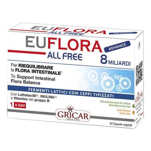 EUFLORA 4 ALL FREE Integratore alimentare di probiotici tipizzati (Lattobacillus acidophilus e Bifi dobacterium breve), di Vitamine del gruppo B e con il prebiotico Inulina. Utile in caso di scarso apporto con la dieta di tali nutrienti o di aumentato fabbisogno (scorretta alimentazione, cure antibiotiche, diarrea ecc.). L’associazione con le vitamine del gruppo B favorisce le naturali difese organiche contro le aggressioni esterne Riequilibrare l’attività metabolica in caso di alterazione della flora intestinale, in seguito a gastroenteriti o scorretta alimentazione.